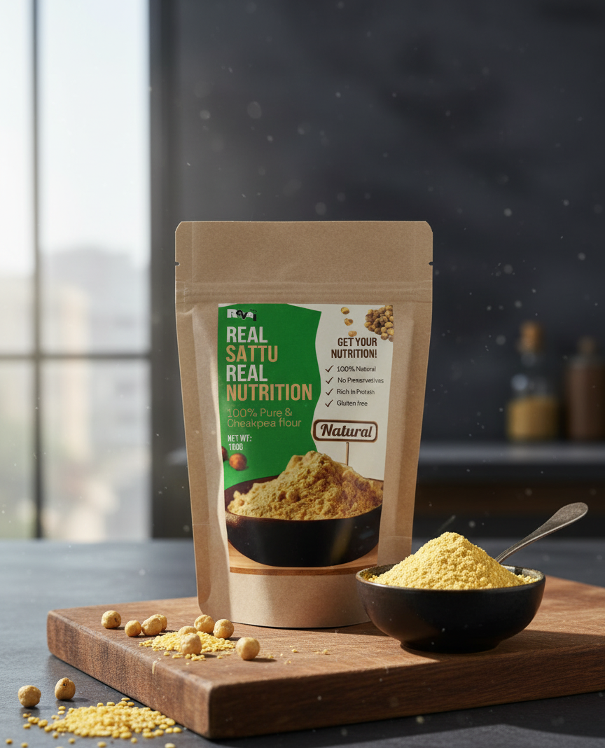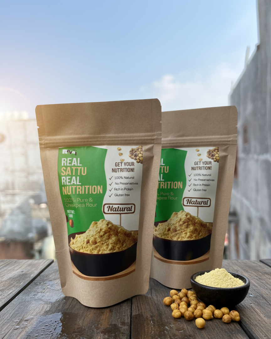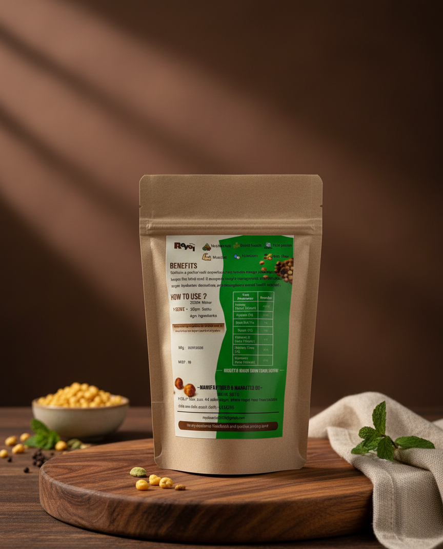 Royal Sattu is a Premium-Quality Roasted gram powder made from the finest ingdrients to give you a natural boost of energy and nutrition. Along with it , you get our special Royal Masala Mix, Perfectly blended with authentic indian spices that enhace taste and digestion.