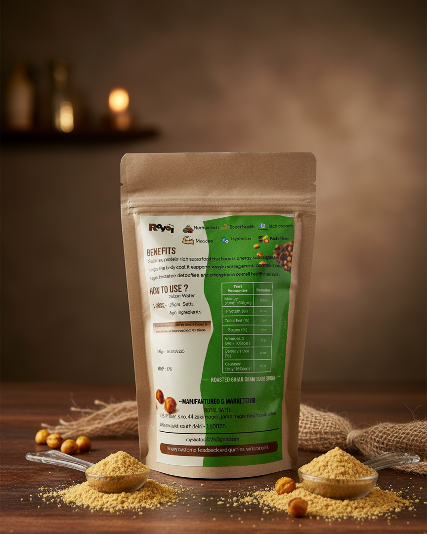 Royal Sattu is a premium-quality roasted gram powder made from the finest ingredients to give you a natural boost of energy and nutrition. Along with it, you get our special Royal Masala mix, perfectly blended with authentic Indian spices that enhance taste and digestion.